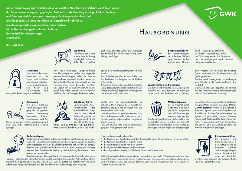 Im Rahmen unserer Bestandsbegehungen verschaffen wir uns einen Eindruck, ob die Mieterschaft ihren Hausordnungspflichten nachkommt. Wenn wir feststellen, dass den Pflichten nicht oder nur unzureichend nachgekommen wird, bieten wir den Mietern an, kleine und große Hausordnung sowie den Winterdienst an ein Reinigungsunternehmen zu übertragen und die entsprechenden Kosten mit der Miete zu belasten.