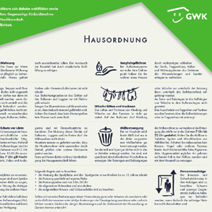 Die große Hausordnung erfolgt turnusgemäß durch die Mieter. Der wöchentliche Wechsel ist innerhalb der Mietparteien zu organisieren (z.B. Aushang eines Jahreskalenders). In Ausnahmenfällen erarbeitet die Genossenschaft einen Ablaufplan.