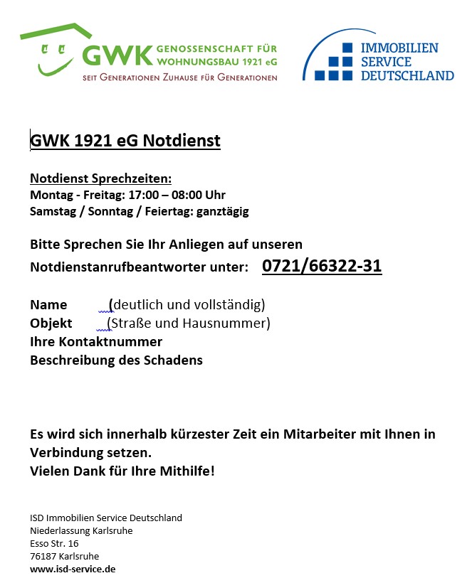 | GWK-Technik | 0721 - 354 822 - 0 schriftlich über info@gwk1921-wohnbau.de |